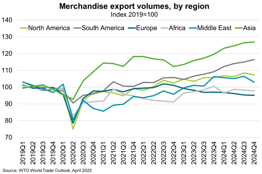Strong exports and investment saw Asia account for nearly 60% of global growth in 2024, despite lacklustre domestic demand. Robust exports (Chart) reflected demand for high-technology products, including a surge driven by artificial intelligence. However, Asia is particularly exposed to trade tensions and fragmentation.